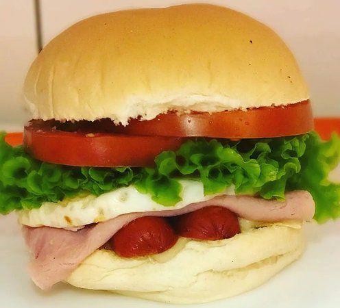 pão, hambúrguer, ovo, salsicha, queijo, presunto, alface, tomate. Acompanha Maionese Temperada.