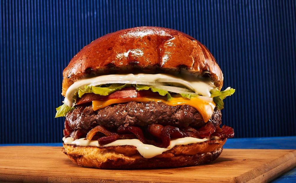 Pão, hamburguer, bacon, ovo, queijo, presunto, alface, tomate, milho, batata palha. Acompanha Maionese Temperada.
